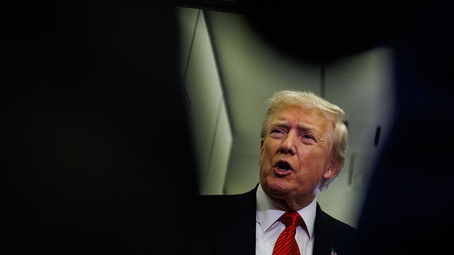 WEST PALM BEACH, FLORIDA - NOVEMBER 2: U.S. President Donald Trump speaks to reporters aboard Air Force One en route to the White House on November 2, 2025 after taking off from Palm Beach International Airport in West Palm Beach, Florida. Trump spen