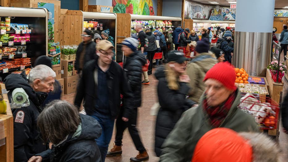 NEW YORK, NEW YORK - FEBRUARY 22: People rush to get groceries after waiting in line for the opening of a Trader Joe's grocery store on February 22, 2026 in New York City. A major winter storm is expected to hit the Northeast and Mid-Atlantic regions