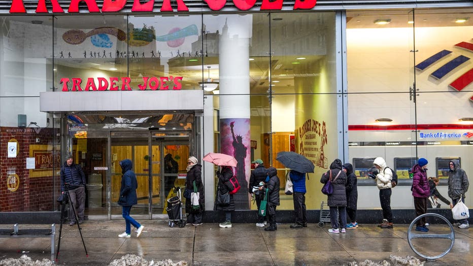 NEW YORK, NEW YORK - FEBRUARY 22: People wait in line for the opening of a Trader Joe's grocery store on February 22, 2026 in New York City. A major winter storm is expected to hit the Northeast and Mid-Atlantic regions bringing heavy snowfall and bl