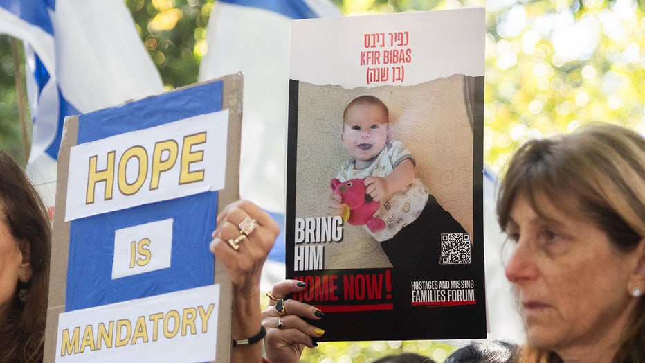 A person holds a poster of hostage Kfir Bibas during a rally to mark the first anniversary of the October 7th terror attacks on Israel on October 06, 2024 in New York City. (Photo by Noam Galai/Getty Images)