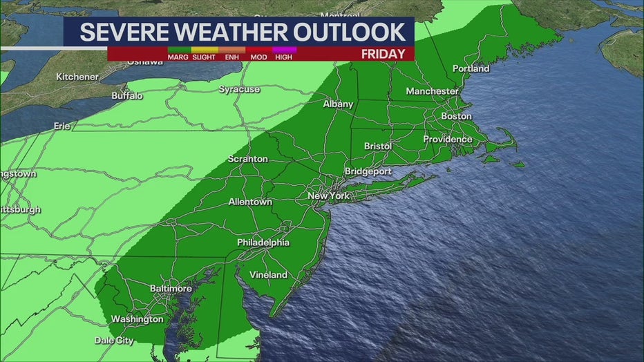 Meanwhile, severe thunderstorms are also possible for Friday afternoon and evening. The New York City area is under a marginal risk for severe weather, which is defined as "some storms could be capable of damaging winds and severe hail. Localized tornado threat could develop."