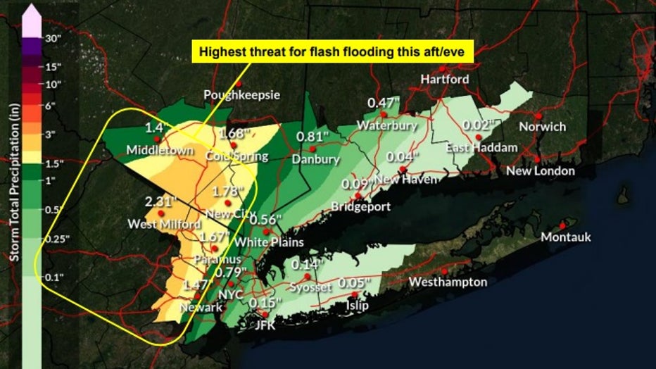 - Northeastern New Jersey and much of the Lower Hudson Valley: Scattered to numerous instances of flash flooding possible. The NWS says the region will likely see 1 to 3" of rain, with as much as 5" possible locally.