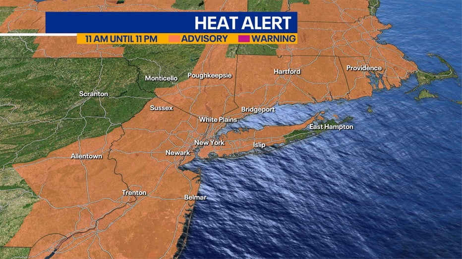 A heat advisory, as well as an air quality alert, is in effect for New York City. Flood watches are also in place for parts of northwest New Jersey: