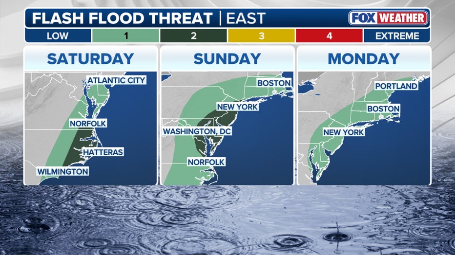 This graphic shows flash flood threats to the East Coast Saturday to Monday. (FOX Weather)