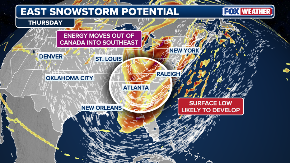 FOX Weather meteorologists say the developing system is part of a broader La Niña winter pattern, which has returned after a brief lull and favors colder, stormier conditions across the eastern U.S.