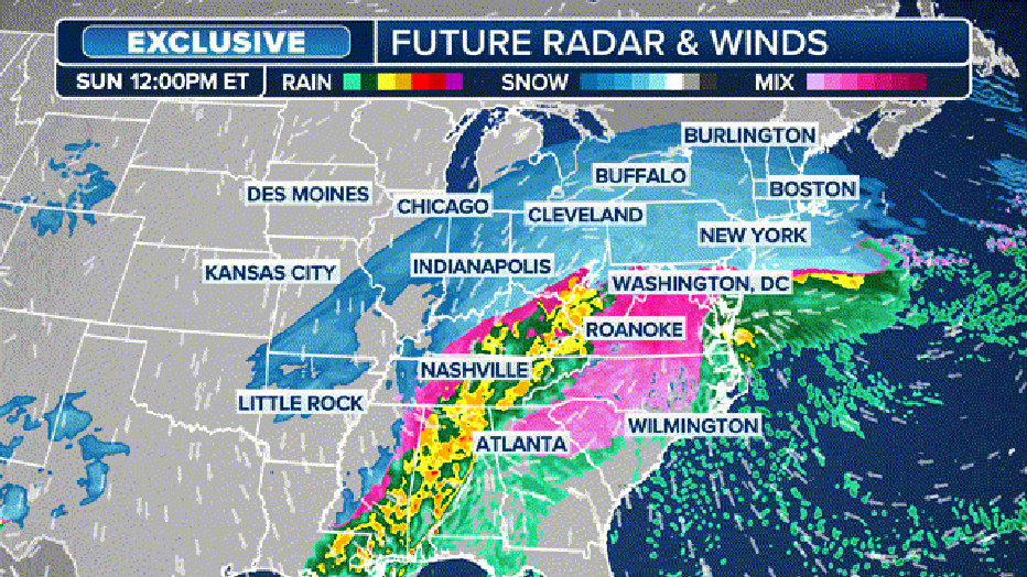 This graphic displays the future radar and pressure for the winter storm charging east through Monday. (FOX Weather)