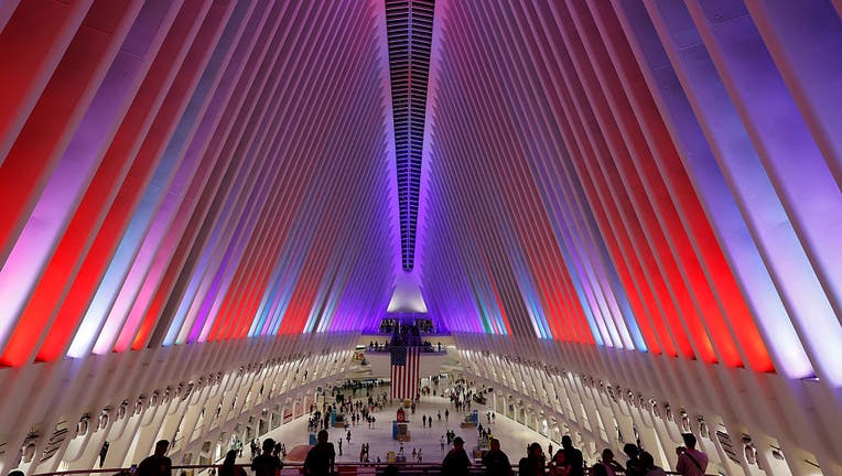 NEW YORK, NY - JULY 4: The Oculus transit hub is illuminated in red, white, and blue to mark Independence Day on July 4, 2025, in New York City. (Photo by Gary Hershorn/Getty Images)
