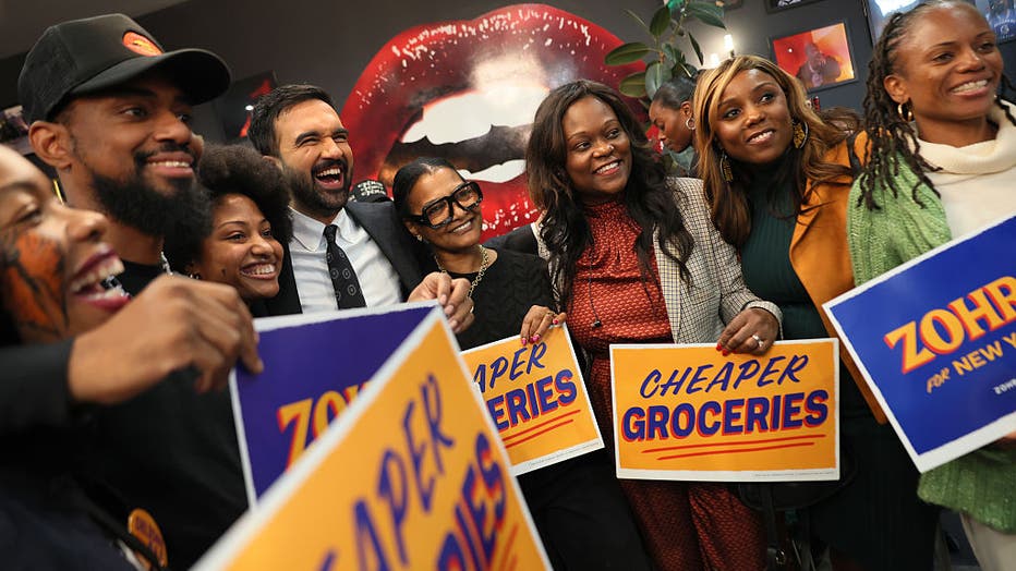 NEW YORK, NEW YORK - OCTOBER 25: Democratic Mayoral Candidate Zohran Mamdani takes photos with supporters inside of Lips Cafe alongside Assembly member Rodneyse Bichotte Hermelyn and Councilmember Farah Louis on October 25, 2025 in the East Flatbush