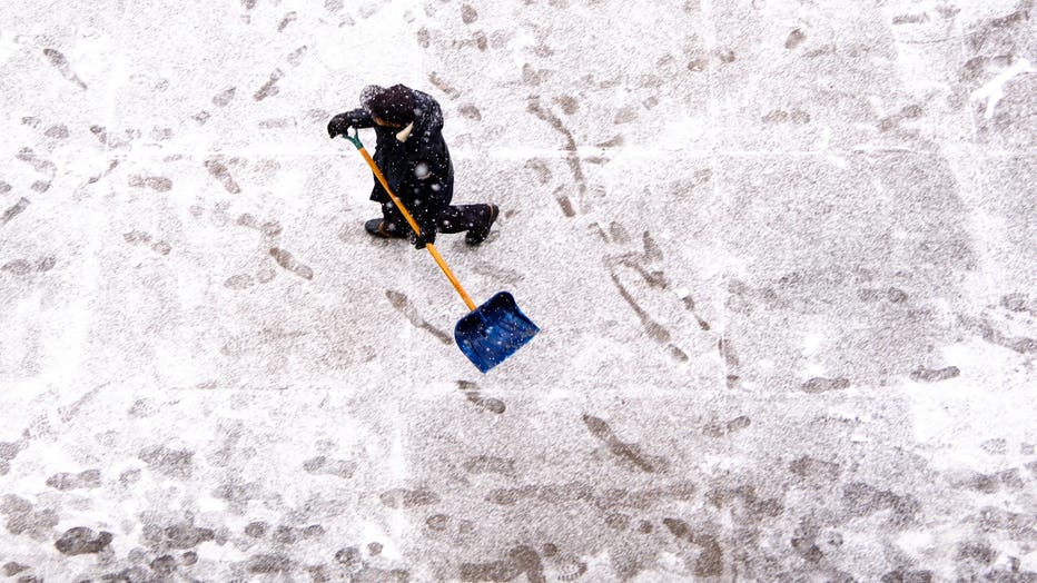TOPSHOT - A man shovels the snow in the Hamilton Heights neighborhood in the Manhattan borough of New York City on December 14, 2025. (Photo by CHARLY TRIBALLEAU / AFP via Getty Images)