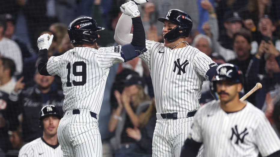 NEW YORK, NEW YORK - OCTOBER 08: Ryan McMahon #19 of the New York Yankees celebrates with Aaron Judge #99 after hitting a solo home run against the Toronto Blue Jays during the third inning in game four of the American League Division Series at Yanke