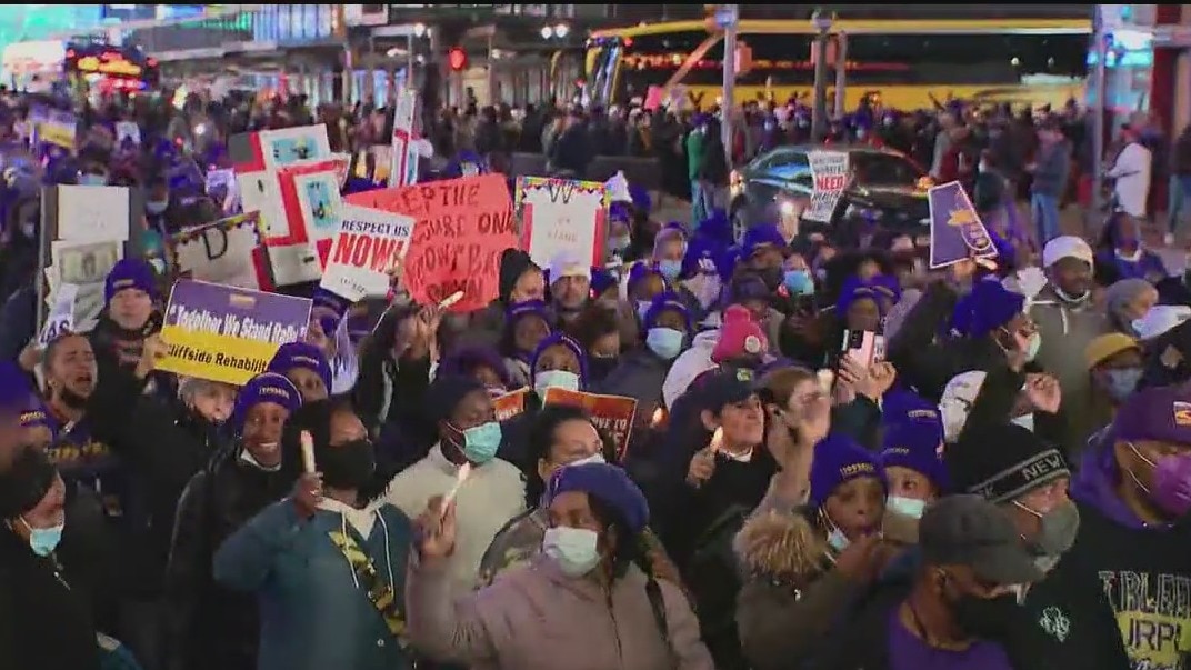 Thousands of nursing home workers flooded the streets of Midtown Manhattan Wednesday to demand better pay, health benefits and retirement.