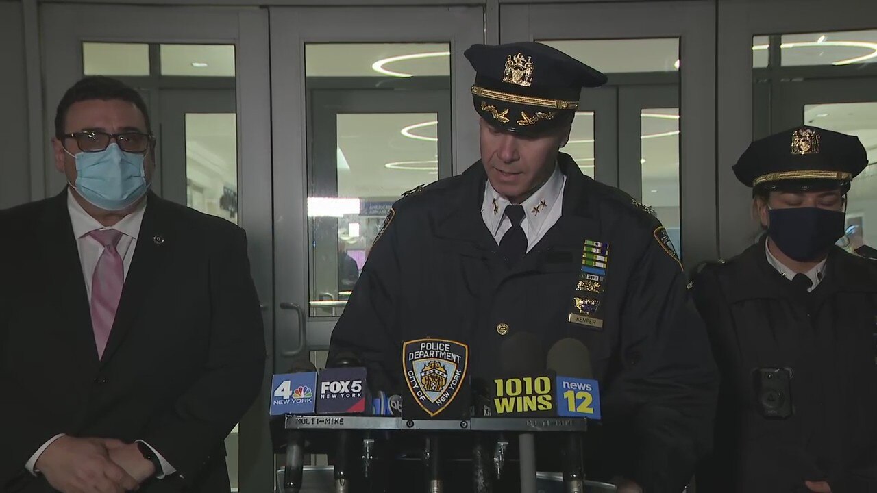 An official with the NYPD briefed reporters on a shooting inside the Kings Plaza Shopping Center in Brooklyn.