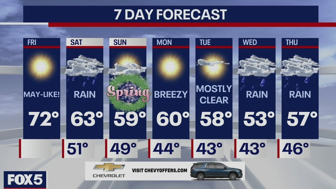 Expect mostly clear skies and a high of 72 in NYC. Saturday brings rain and Sunday, the first day of Spring, should be dry, gusty and sunny.