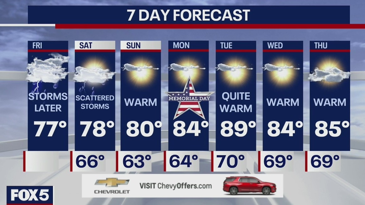 A muggy and cloudy afternoon is ahead. Showers and thunderstorms are expected later. Showers will linger into Saturday. Today's high is 77 degrees. The low is 66 degrees.