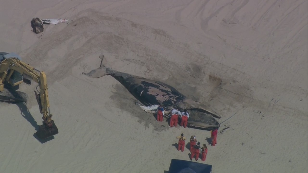 The view from SkyFOX shows crews investigating a dead whale that washed ashore at Smith Point County Park on Long Island.