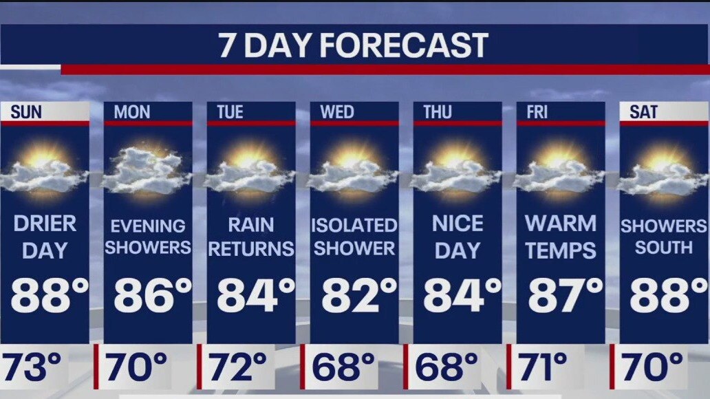 Temperatures remain in the mid 80's with some scattered showers throughout the week.