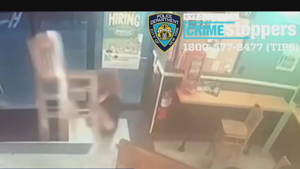 The NYPD is looking for the suspect they said threw a chair at an elderly man in a sandwich shop in Lower Manhattan.