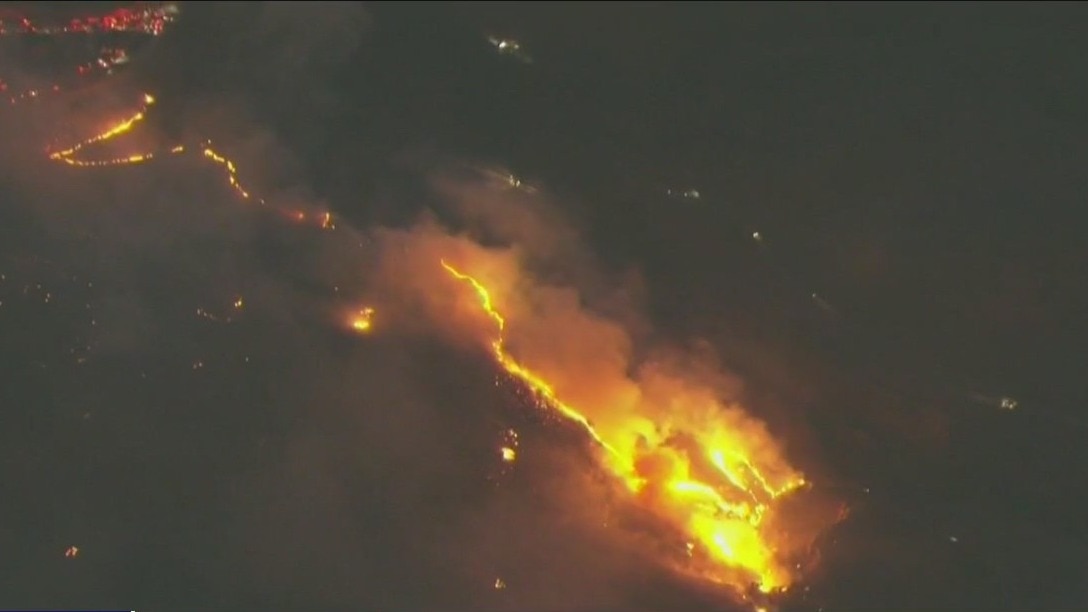 Officials say the two biggest wildfires ravaging the Los Angeles area this week have burned at least 10,000 homes, buildings and other structures. Officials urged more people to heed evacuation orders Thursday after a new blaze ignited and quickly grew.