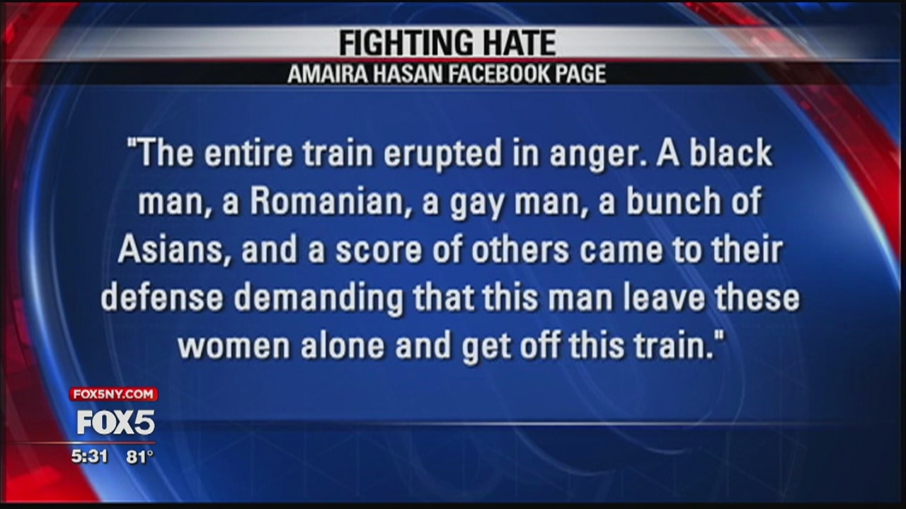 A woman says she witnessed a subway car-full of commuters come to the defense of two Muslim women who were being verbally assaulted by a racist man.