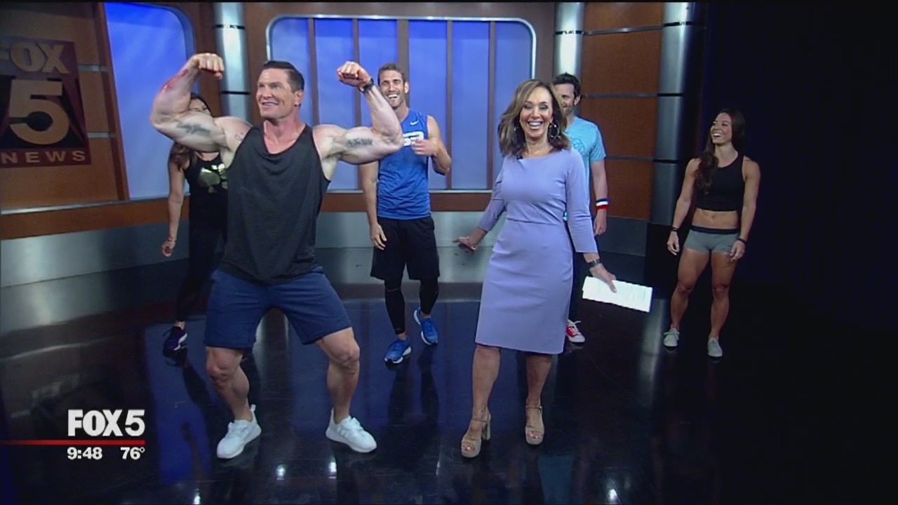 Model and physical trainer CJ Kogel leads Steve Weatherford, Tina Cervasio and several fitness models through his signature workout.
