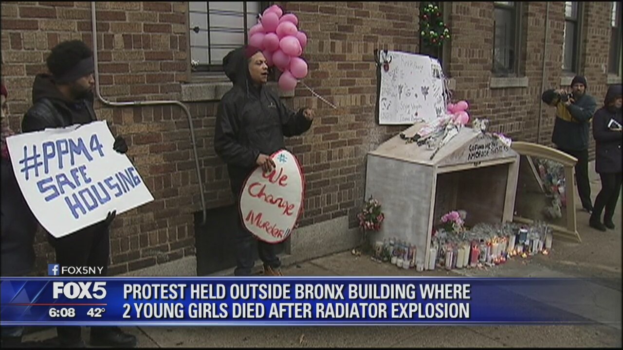 Protestors gathered outside a building in the Bronx where two young girls died after a radiator exploded.