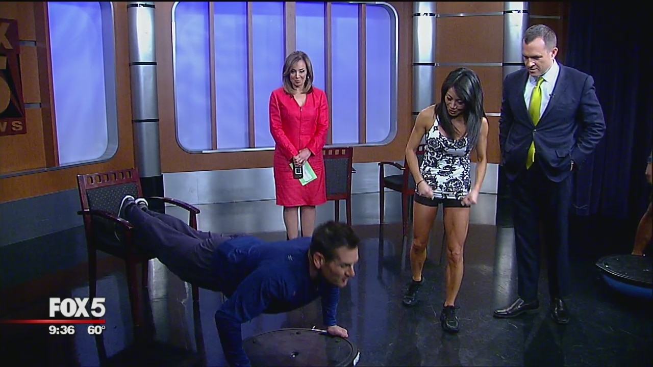 Anita Bae, owner of The HIIT Barre Studio in Ardsley, New York, guides Duke, Mike and Greg through exercises using the barre method.