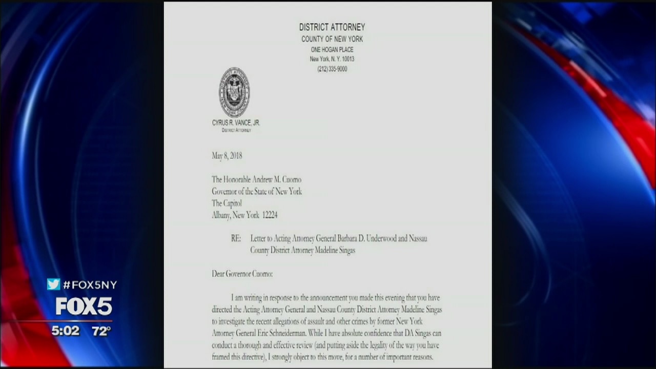 Gov. Andrew Cuomo appointed Nassau County DA Madeline Singas as a special prosecutor to probe former Attorney General Eric Schneiderman. But Manhattan DA Cy Vance Jr. objected to being removed from the case. An article in the New Yorker chronicled allegations from four women who said that Schneiderman physically abused them.