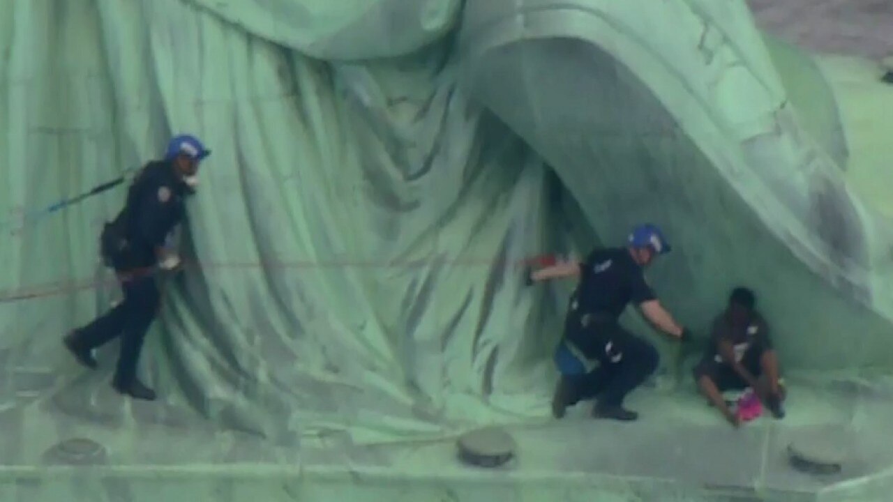 A woman climbed the exterior of the structure of the Statue of Liberty and then sat down by one of the statue's feet around 4 p.m., authorities said. U.S. Park Police and NYPD officers spent hours trying to talk her down. She spent some time sitting, lying, and moving around the base. At one point, she removed her sneakers and tried to climb higher on the statue but wasn't able to get any higher.