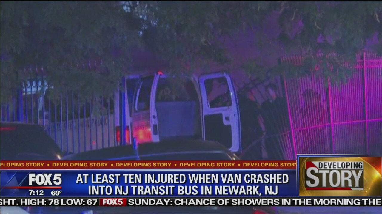 10 people were hurt when a stolen church van crashed into an NJ Transit bus in Newark.