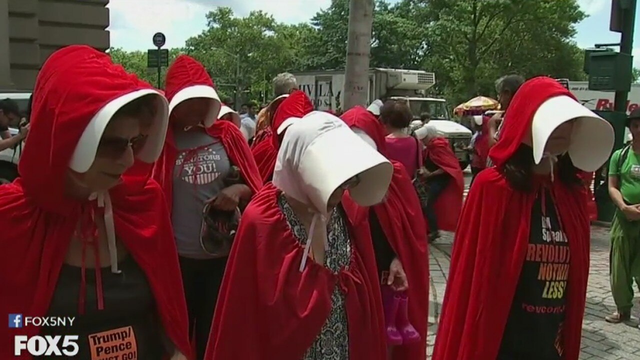 Vice President Mike Pence and Homeland Security Secretary Kristen Nielsen were in New York on Tuesday to talk about cybersecurity. But dozens of protesters, including some dresses like characters from the dystopian book and TV series "The Handmaid's Tale."