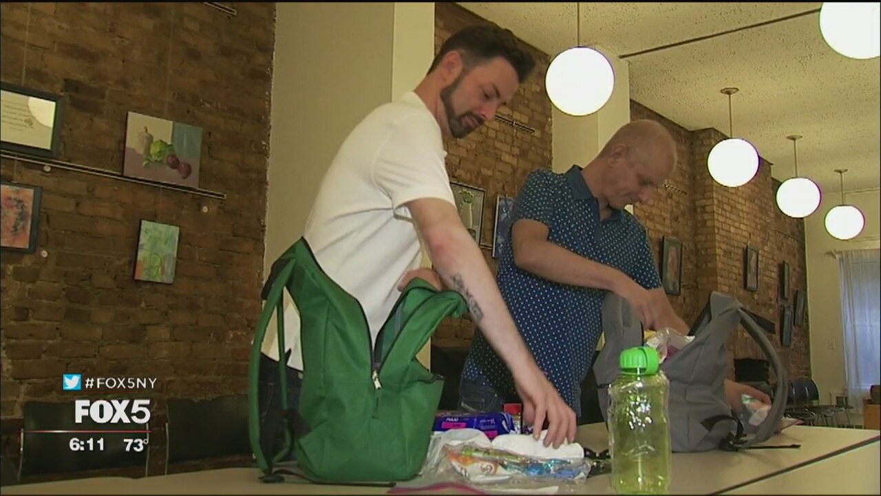 A non-profit puts together backpacks filled with essentials for homeless people in New York City.