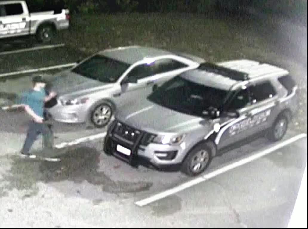 Police are looking for the man seen on security cameras pouring syrup over a police cruiser, while filming himself in the act on a cell phone.