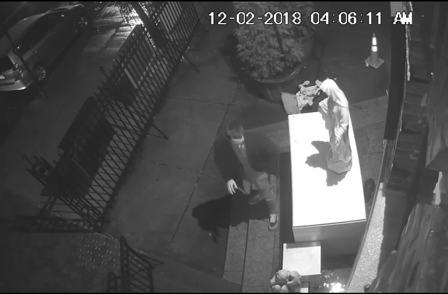 Police in New York were looking for a man who urinated on and then broke two religious statues outside of a Brooklyn church.