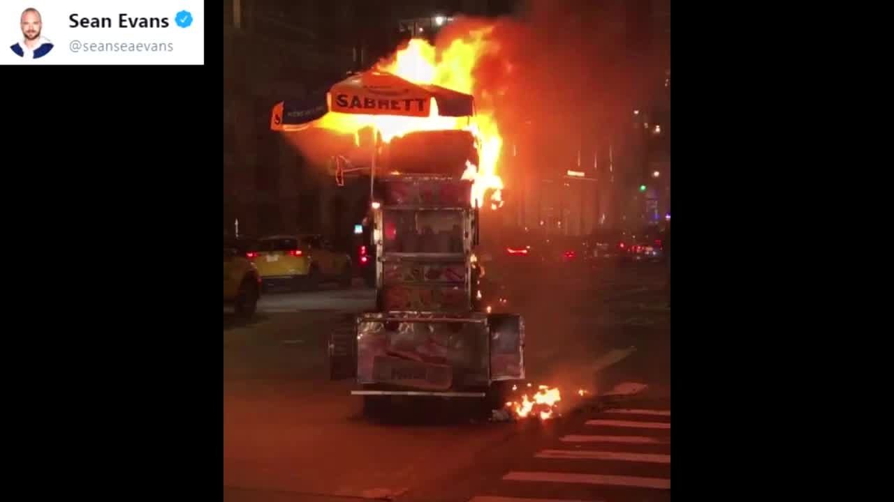 Flames engulfed a food cart in Midtown Manhattan on Tuesday. Firefighters quickly extinguished the fire on West 45th Street and 6th Avenue at about 7 p.m., the FDNY said.