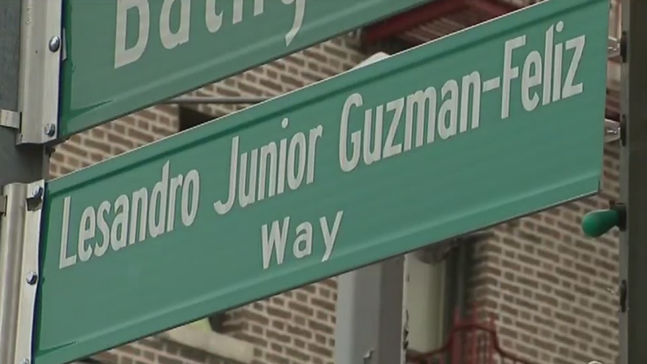 A street renaming ceremony was held Wednesday in the Bronx in honor of a boy killed by alleged gang members last year. Lesandro Junior Guzman-Feliz Way became the co-name of Bathgate Avenue?at East 183rd Street. The sign is up on the corner across from the site?where the?15-year-old was viciously assaulted and killed.