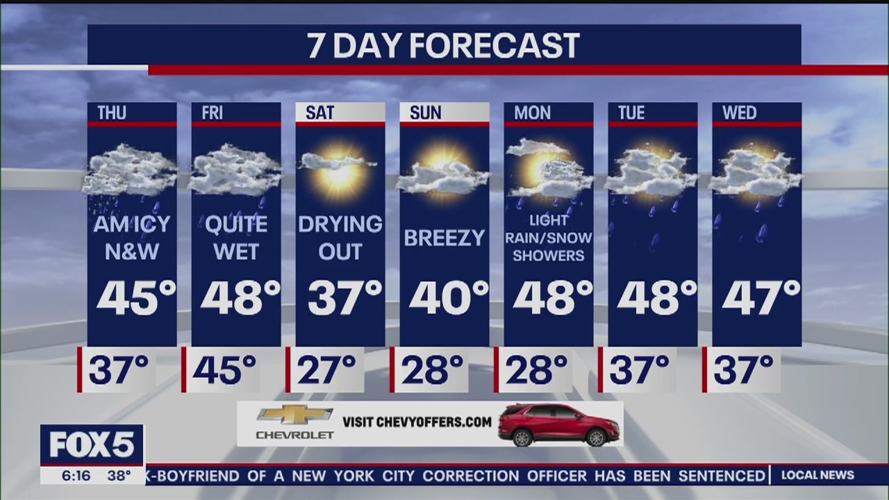 Meteorologist Mike Woods says that we'll have cloudy skies around the Tristate region Thursday morning with plenty of scattered showers and some wintry mix to the northwest of the Metro areas. Rain will be heavy at times, so be on the lookout for some localized flooding especially in central and southern sections of New Jersey.
