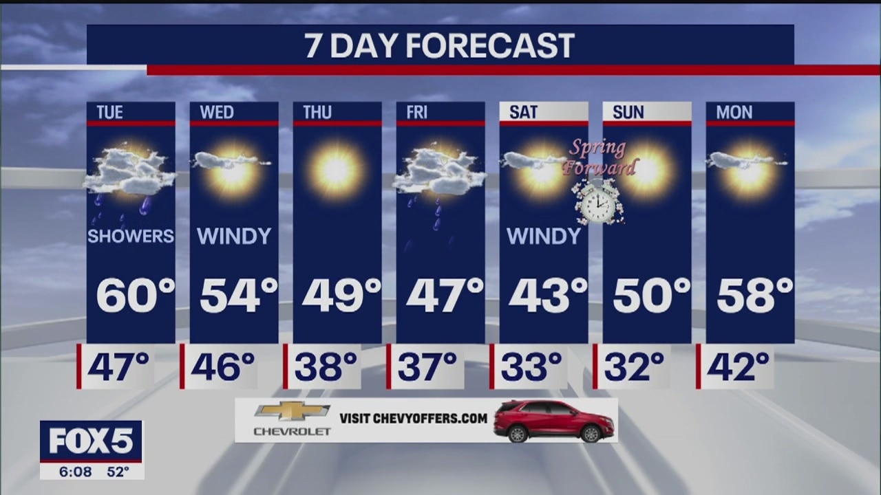 Nick Gregory has the weather forecast. Some sun and mild on Tuesday morning but showers likely later in the afternoon and evening. Lots of sun but a bit windy at times on Wednesday. Sunny and cool on Thursday. Showers back on Friday, which may end as snow showers Friday night. Windy and chilly on Saturday. Spring ahead at 2 a.m. Sunday!