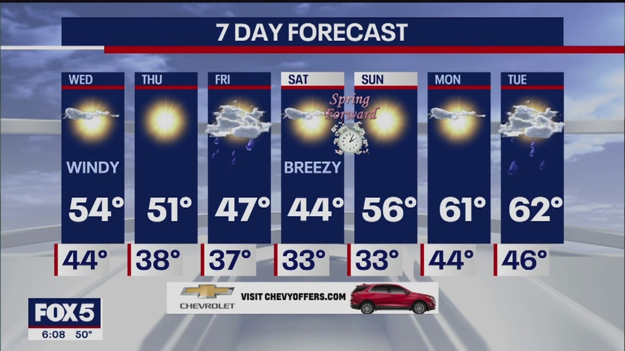Nick Gregory has the weather forecast. Sunshine and windy weather on Wednesday. Less wind and lots of sun for Thursday. Showers arrive Friday that may end as snow showers late at night. A brief cool down on Saturday before temperatures return to the 50s and low 60s.