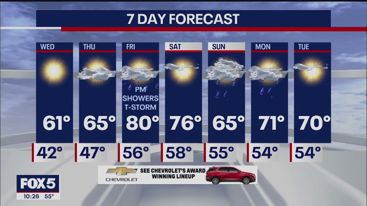Nick Gregory has the weather forecast. Sunny and pleasant for Wednesday. A bit milder on Thursday. We may get to 80 on Friday but there will be the threat of showers and thunderstorms in the afternoon and evening. Lots of sunshine and mild on Saturday. Showers and thunderstorms may return on Sunday.