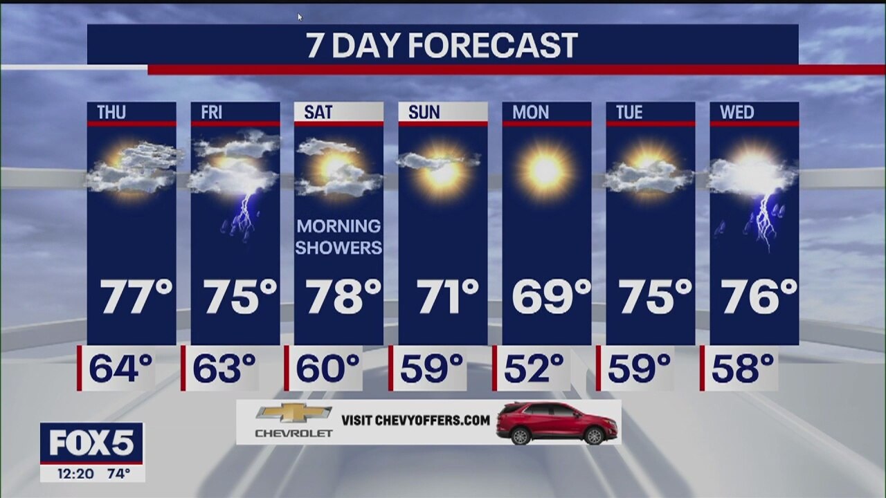 Expect a mostly cloudy sky with temperatures about where they should be for this time of the year. Clouds tend to thicken tonight with patchy showers moving through, too. And again we could see more patchy fog developing. Low will be in the lower 60s.