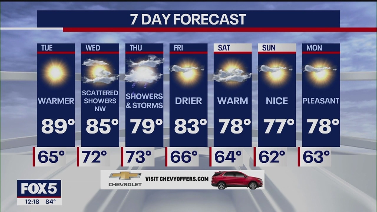 It will be sunny and warmer today with highs reaching the mid-80s this afternoon. It will also be more humid. Tonight will be mostly clear and mild with lows dropping into the upper 60s.