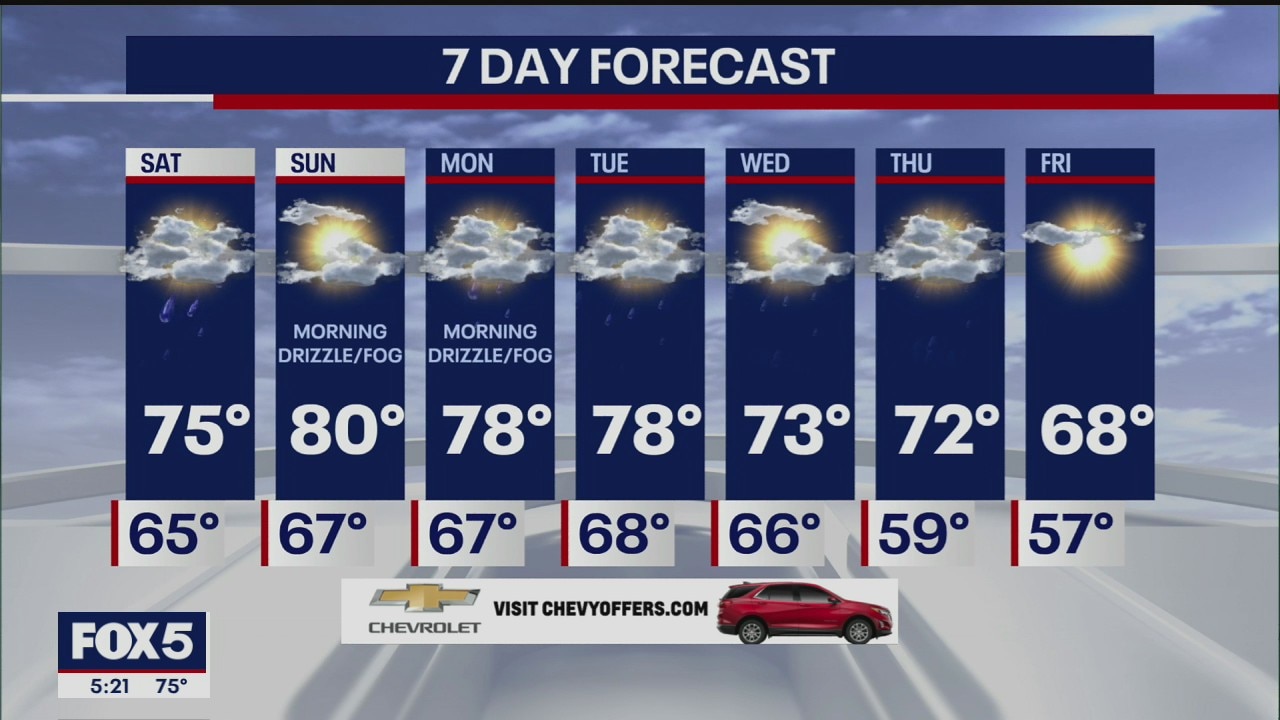 What a way to start the weekend, but it won't stay. There will be showers in spots to the north and west of the city tomorrow, but tonight, expect clouds to gather and patchy fog with temperatures in the mid-60s.