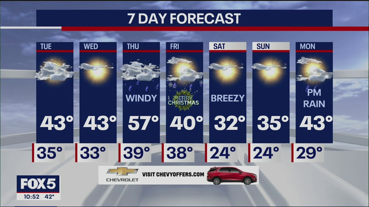 Nick Gregory has the weather: Some rain or snow showers Tuesday morning then breezy with some sun for the afternoon. Sunny and cool on Wednesday. Clouds, rain, and wind move in on Christmas Eve. Turns colder Christmas Day with morning rain/snow showers.