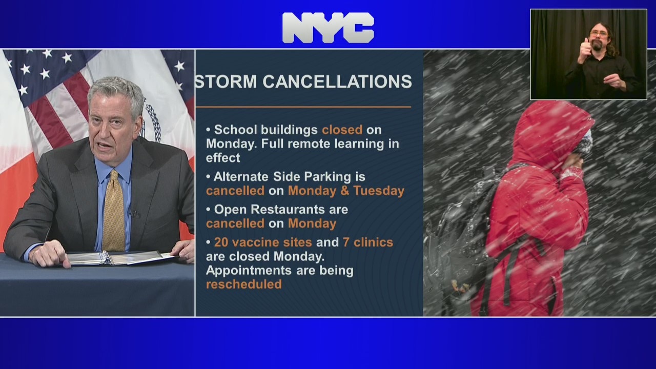 Mayor Bill de Blasio announced cancellations and changes ahead of a major winter storm that was set to hit New York City.