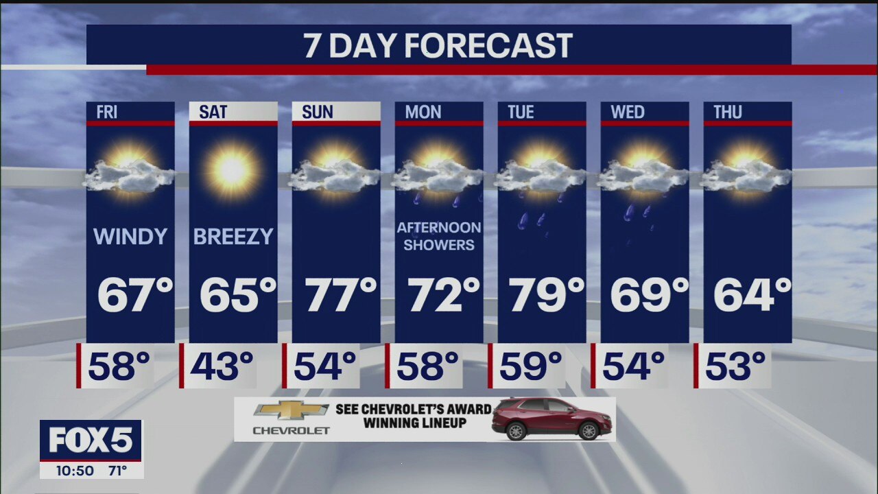 Nick Gregory says Friday will be windy with sunshine and clouds; Saturday will be sunny, breezy, and cool; and Sunday will be milder with sunshine and clouds.