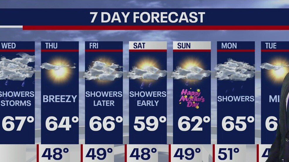 Meteorologist Mike Woods says the high of 67 will be slightly below normal. Expect heavy showers and storms by the afternoon.