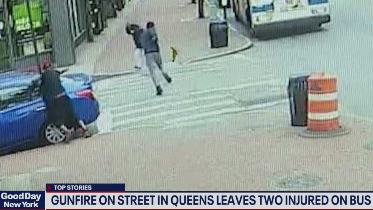 Shocking video shows the moment a man opened fire on a Queens street corner, hitting two people sitting on an MTA bus after missing his intended target.
