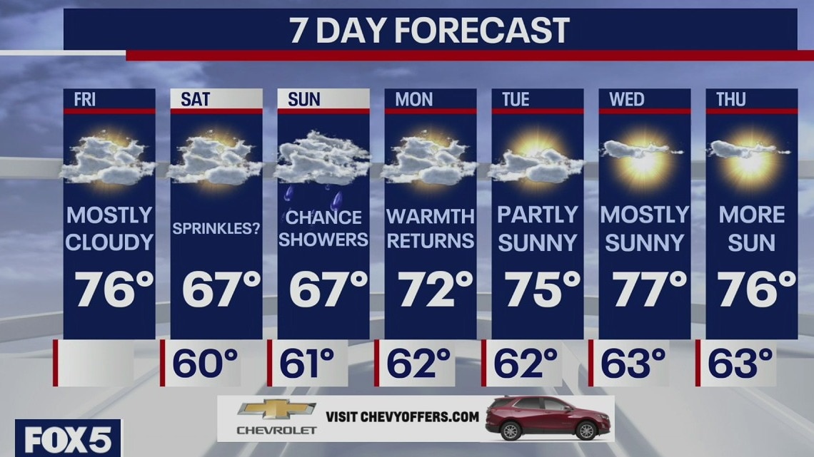 Expect lots of clouds with peaks of sun, too, with a high of 76.