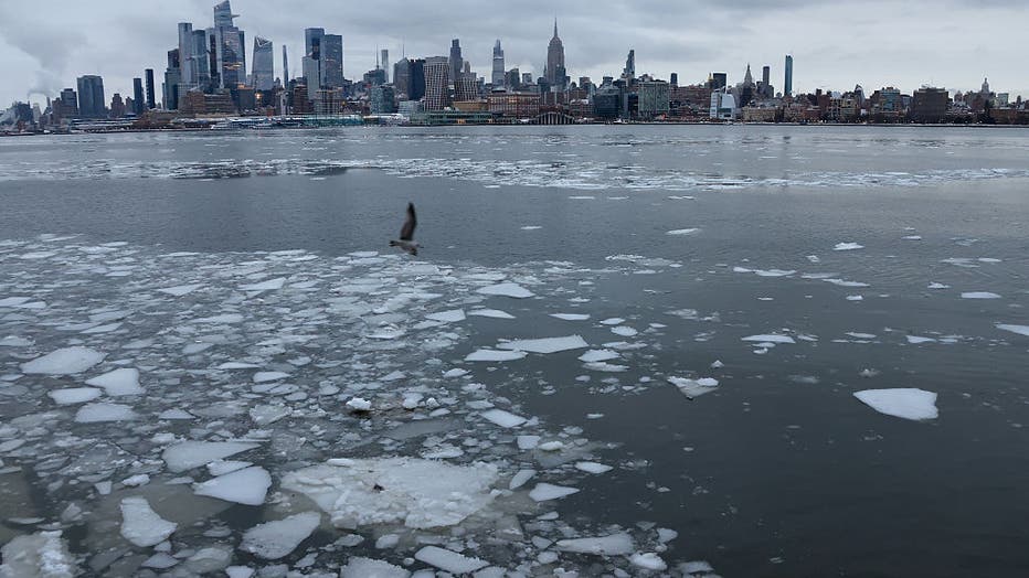 HOBOKEN, NJ - JANUARY 26: Chunks of ice float in the Hudson River in front of the skyline of midtown Manhattan and the Empire State Building in New York City on January 26, 2026, in Hoboken, New Jersey. (Photo by Gary Hershorn/Getty Images)