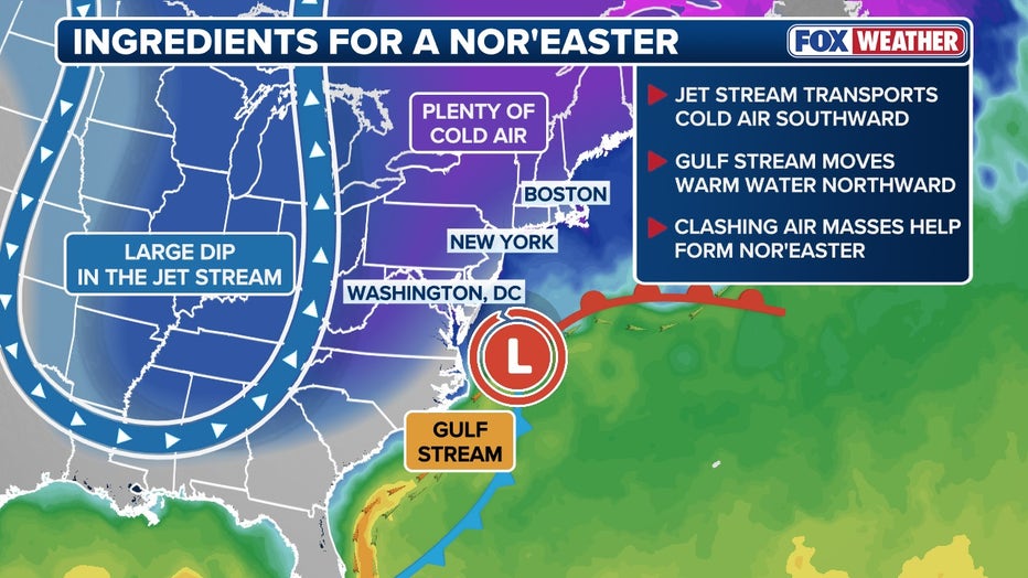 FOX Weather says the developing storm has a strong likelihood of rapidly intensifying, a process known as "bombing out," which could turn it into a bomb cyclone. Forecast models suggest the storm’s central pressure could drop dramatically as it moves offshore, a sign of rapid strengthening.